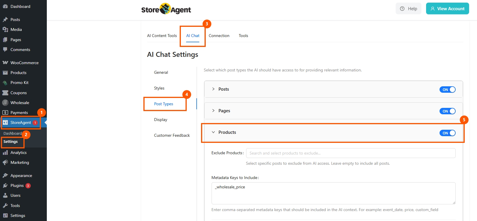 Go to AI Chat > Post Types > Products to manage the product data that StoreAgent can use in AI responses