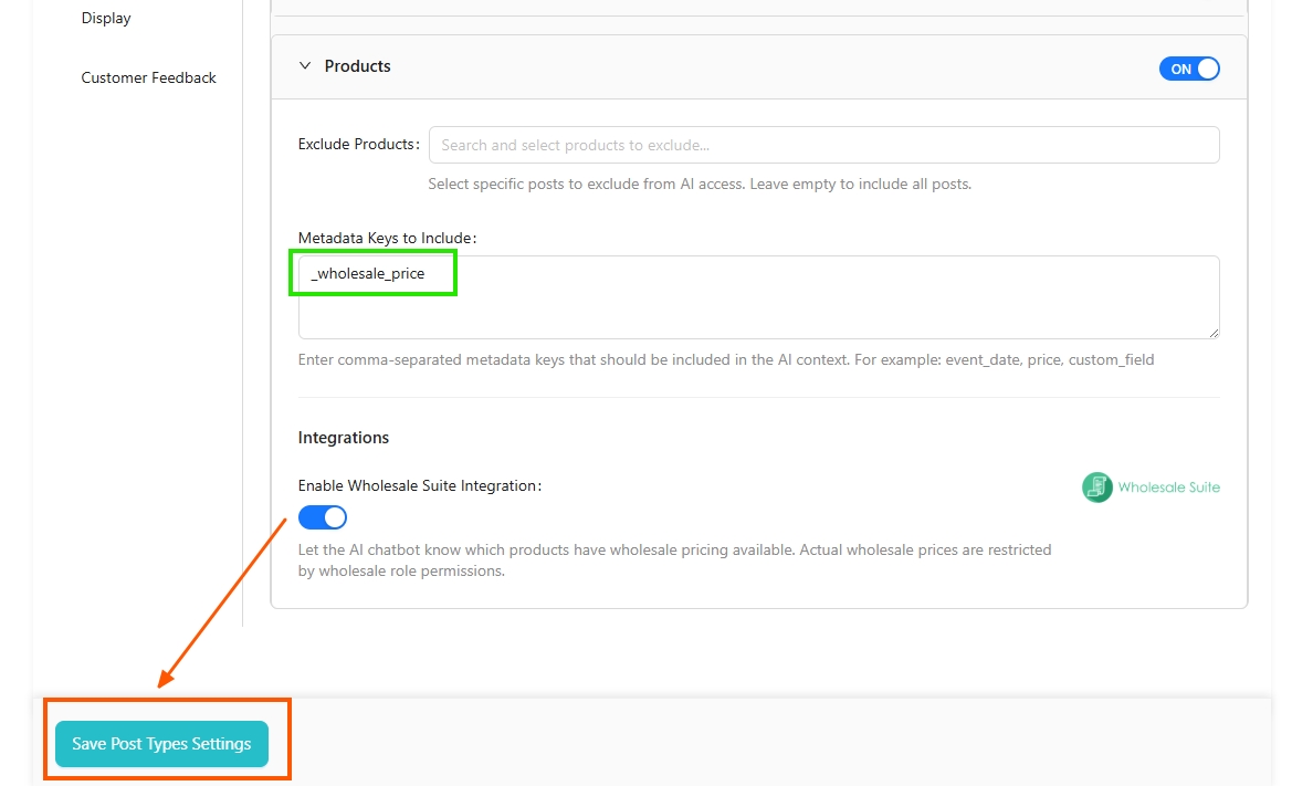 Click Save Post Types Settings after enabling the Wholesale Suite integration and adjusting product metadata settings