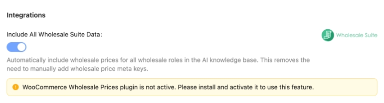 If WooCommerce Wholesale Prices is not active StoreAgent shows a notice that the Wholesale Suite integration cannot be used yet