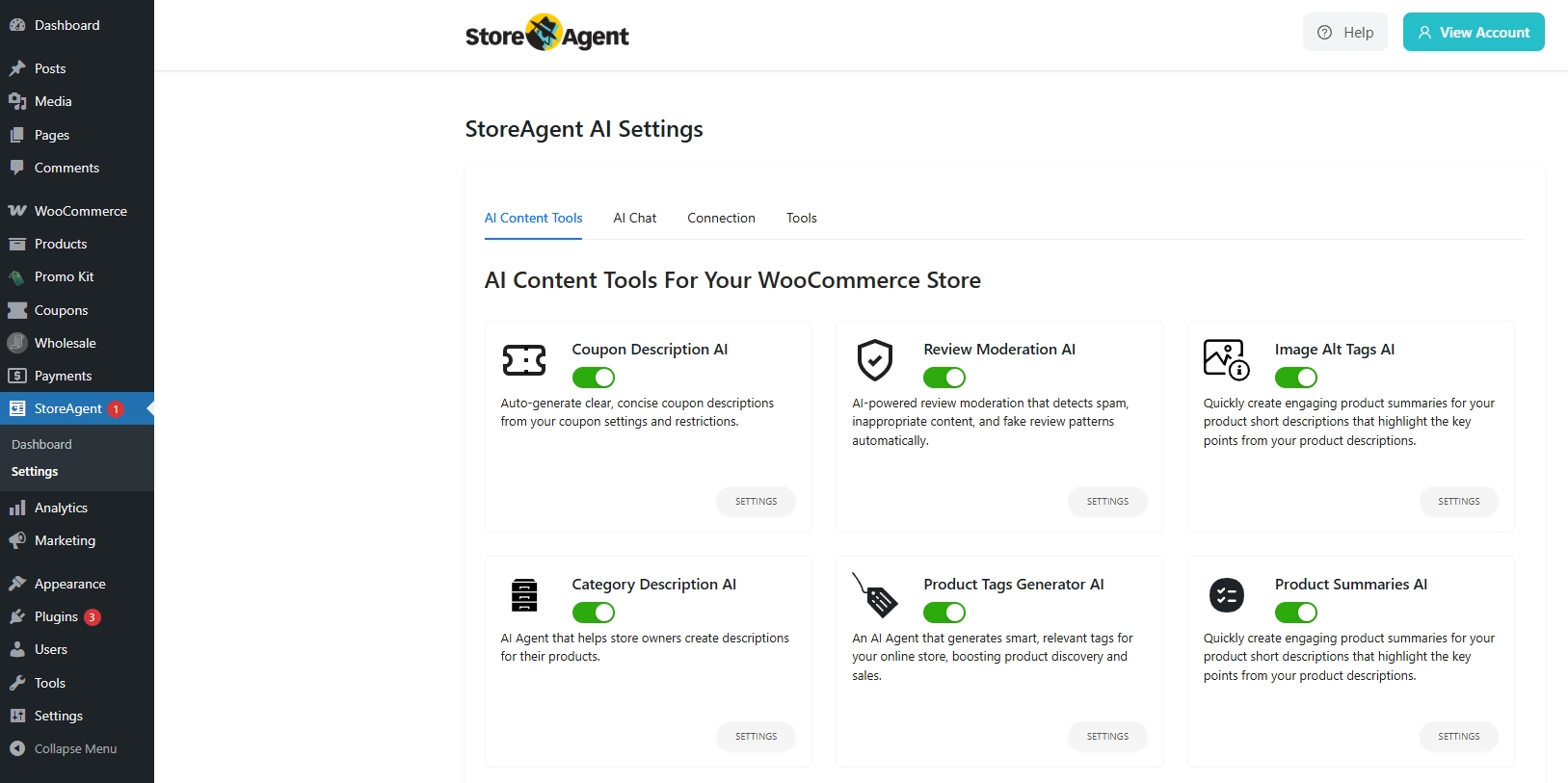 StoreAgent settings dashboard in WordPress showing the AI Content Tools page with sections for AI Chat, Connection, and Tools
