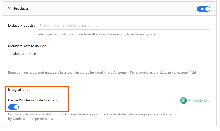 Once you switch that on, StoreAgent can include wholesale-related pricing and metadata from Wholesale Suite inside its AI product context. That means the chatbot has access to wholesale pricing information when responding to product-related questions.