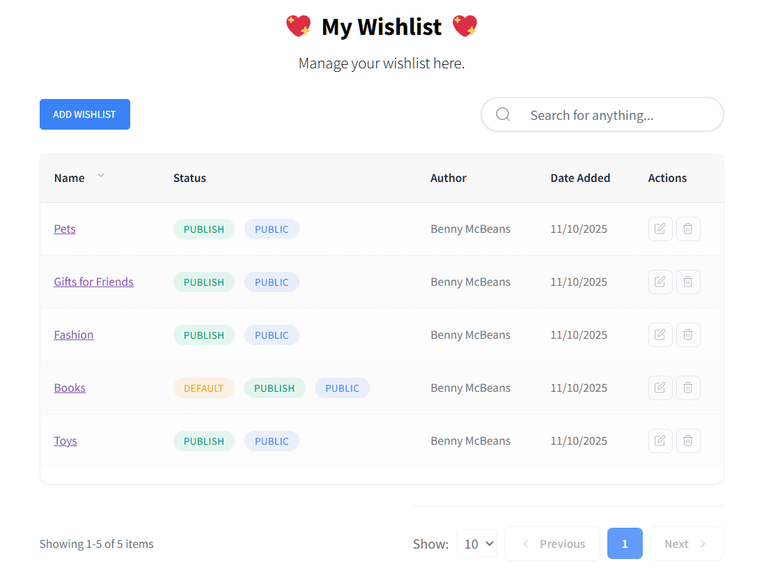4. The full “My Wishlists” page