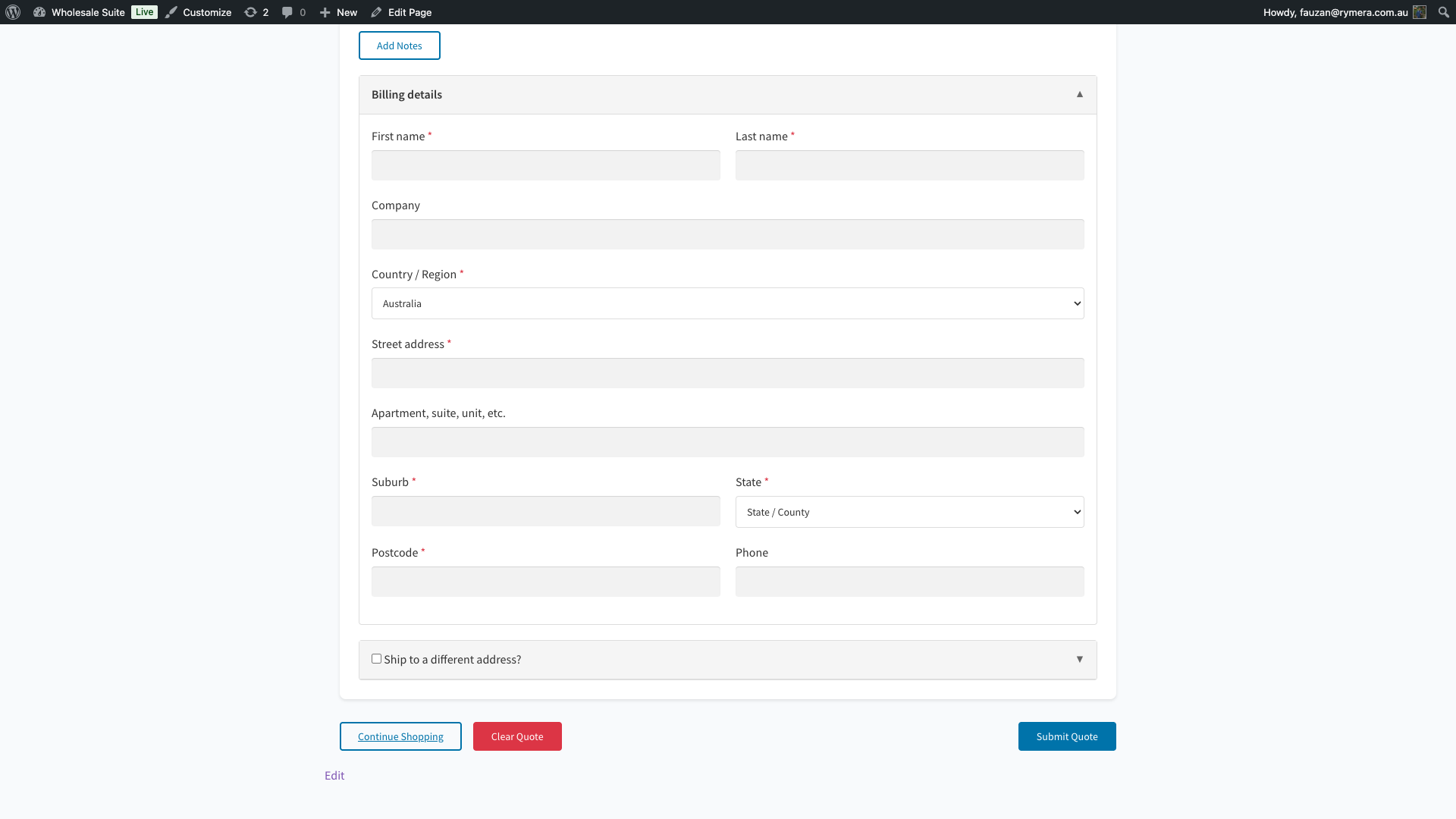 When address collection is enabled, the quote submission form includes billing and shipping address fields, letting you collect delivery details at the quote stage rather than at checkout.