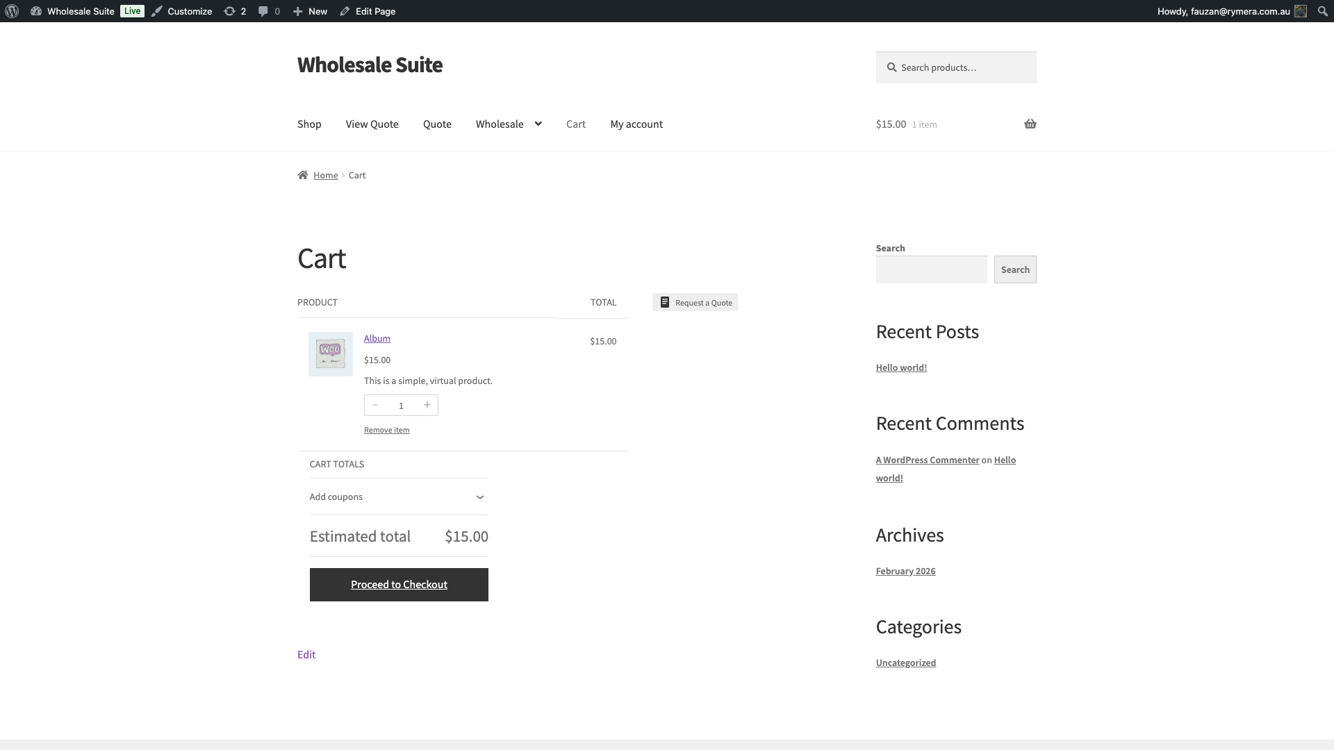 Enable cart to quoteShows a “Request a Quote” button in the cart. When clicked, the cart contents are submitted as a new quote.Enabled