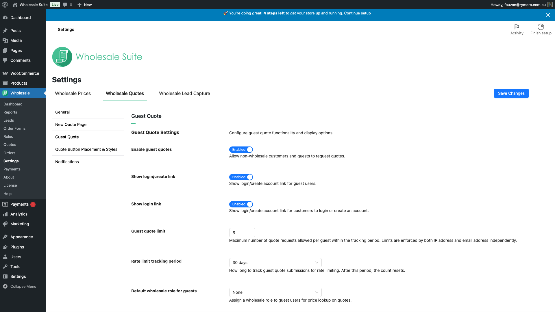 The Guest Quote tab controls whether visitors who aren’t logged in (or who don’t have a wholesale role) can submit quotes, and how their submissions are rate-limited to prevent abuse.
