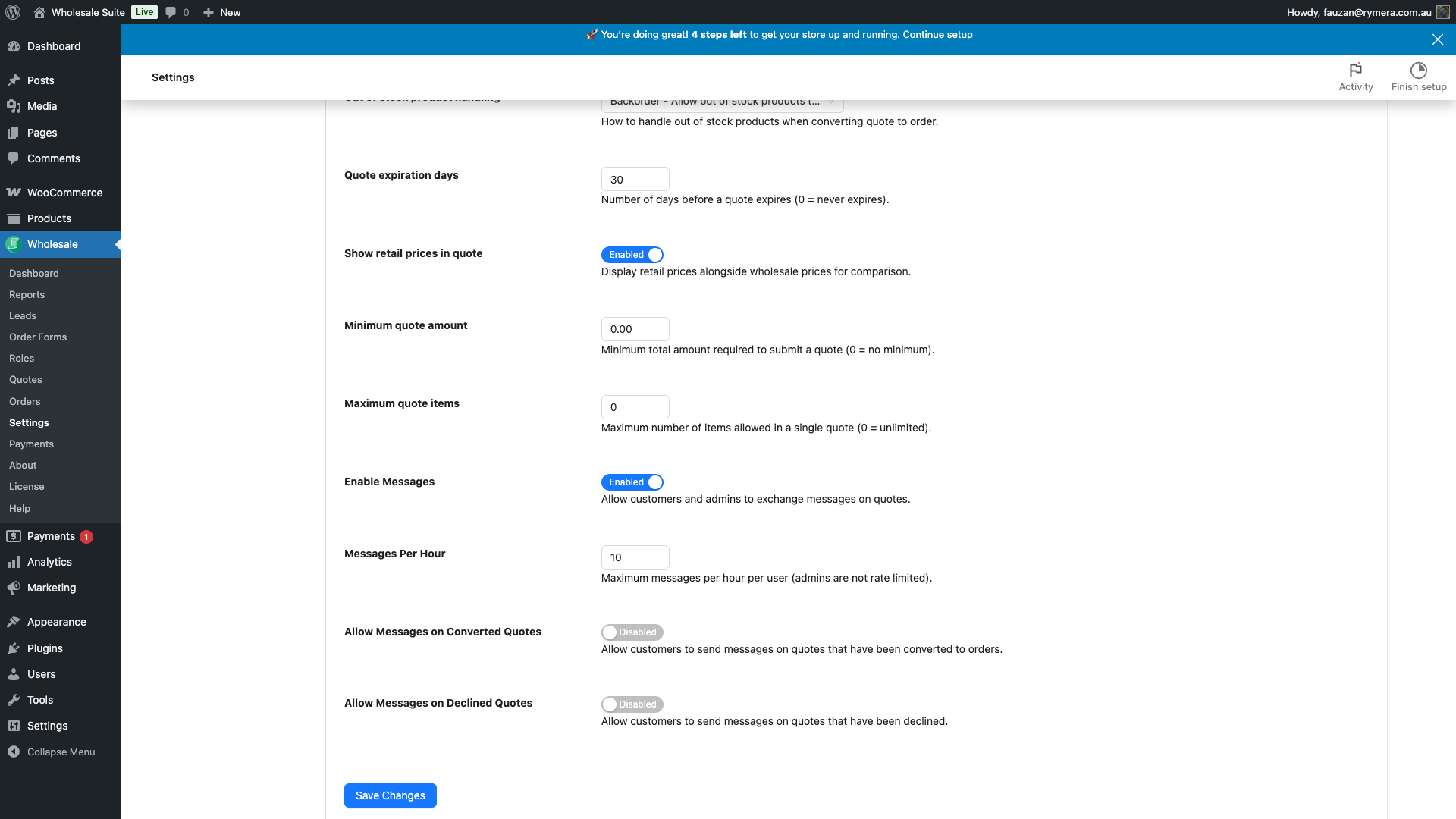The Wholesale Prices admin settings page with the Wholesale Quotes main tab selected