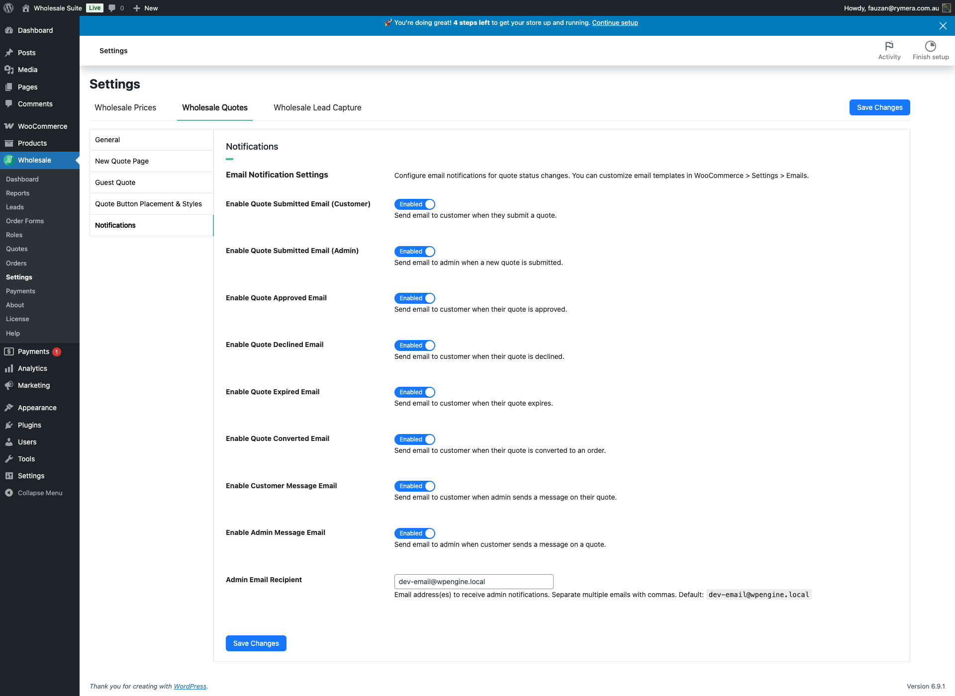 The Notifications tab lets you turn each automated quote email on or off individually, and set the email address that receives admin-facing notifications.