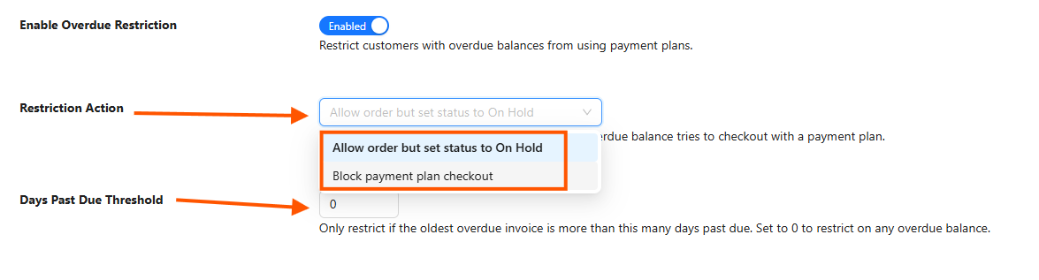 Choose how you want to restrict payment plan availability when a customer is overdue: