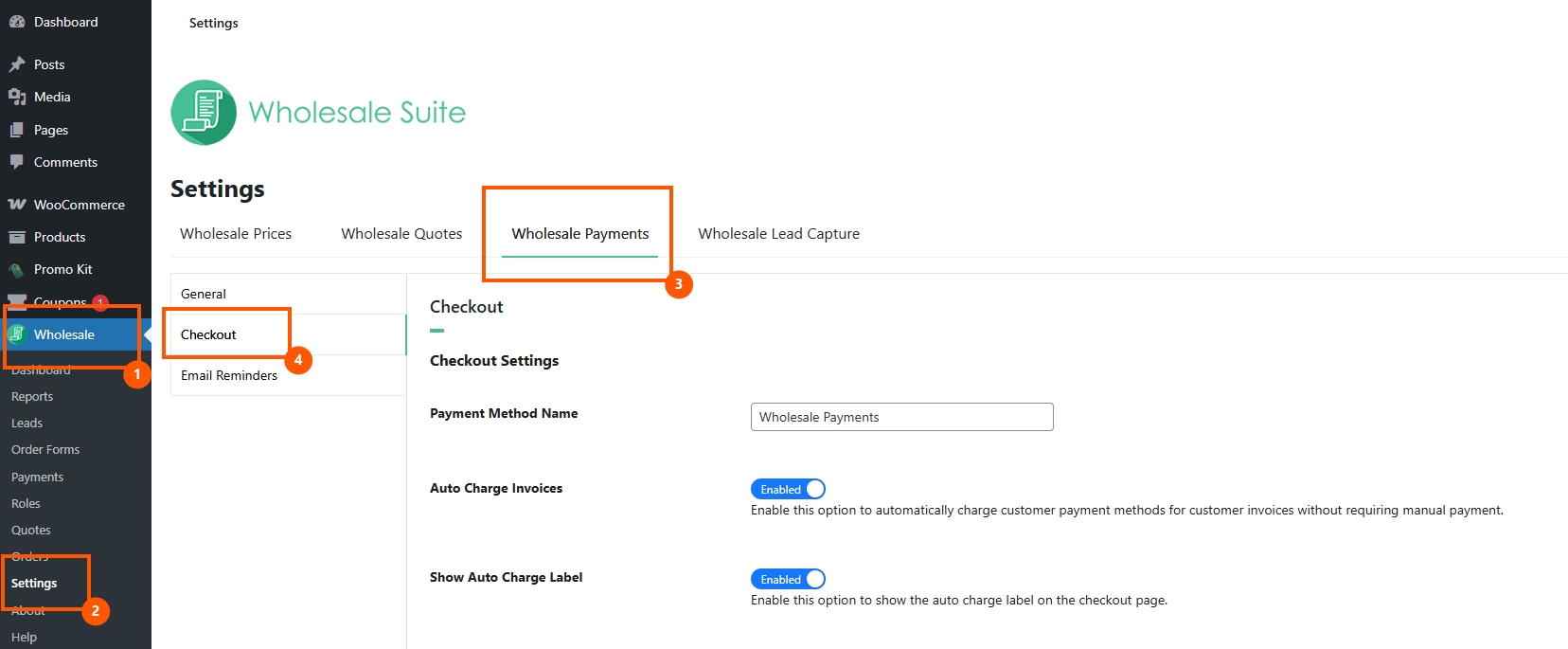 Setting up the restriction is straightforward. Navigate to WP Admin → Wholesale Settings → Wholesale Payments → Checkout and look for the new Overdue Restrictions section.