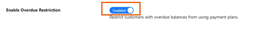 This toggle activates or deactivates the payment plan availability restriction. When disabled, all customers have unrestricted access to payment plans regardless of their overdue status.