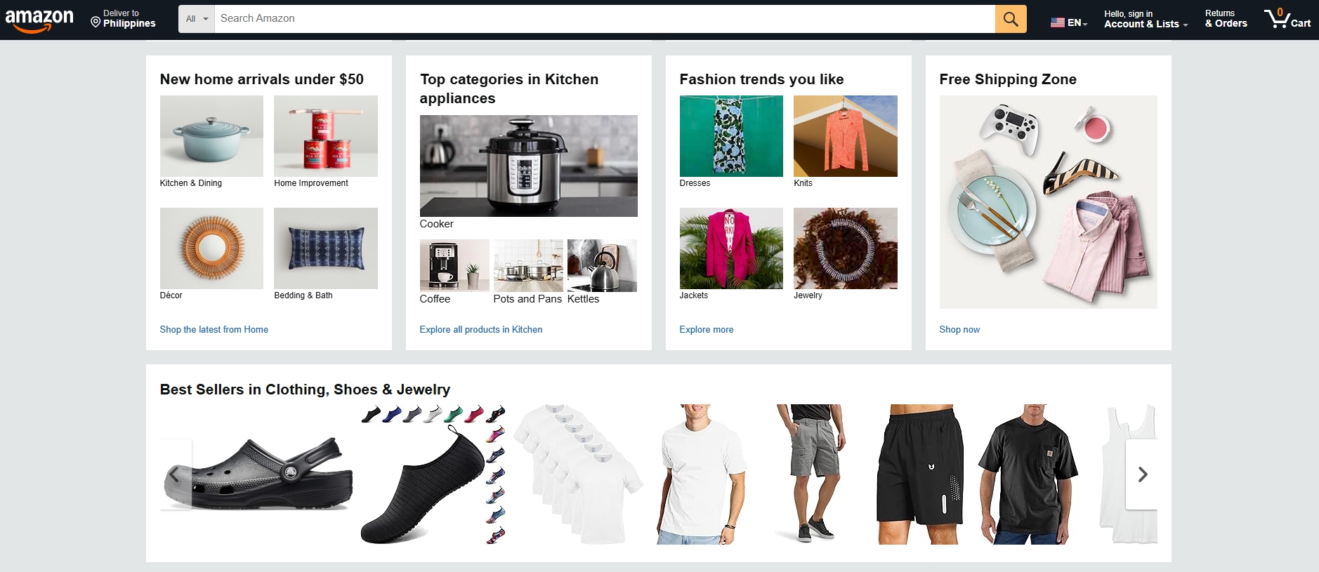 Amazon homepage showing personalized product recommendations, category highlights, and top-selling items in a clean digital layout