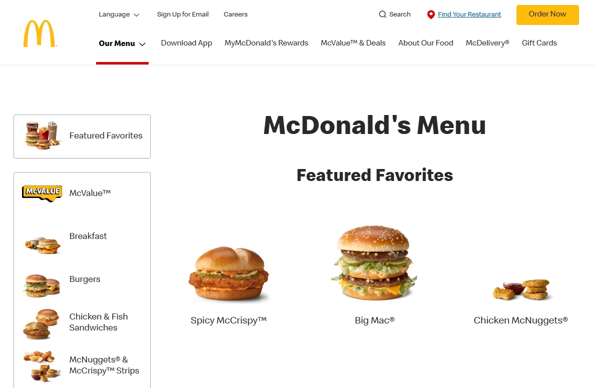 McDonald’s online menu showcasing featured favorites including the Spicy McCrispy, Big Mac, and Chicken McNuggets, with product categories listed on the sidebar