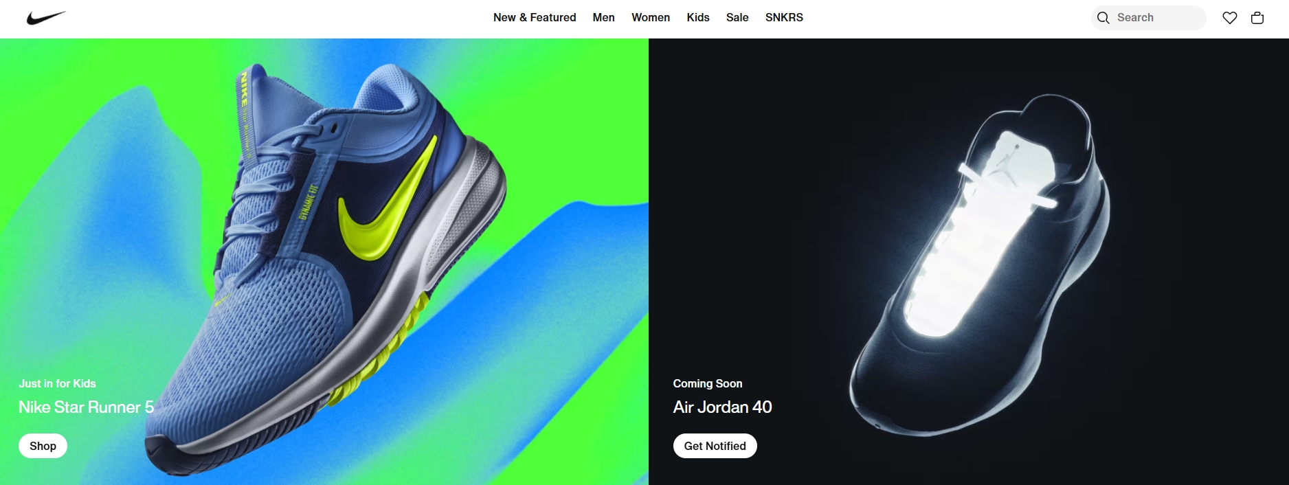 Nike homepage displaying the Nike Star Runner 5 and the upcoming Air Jordan 40