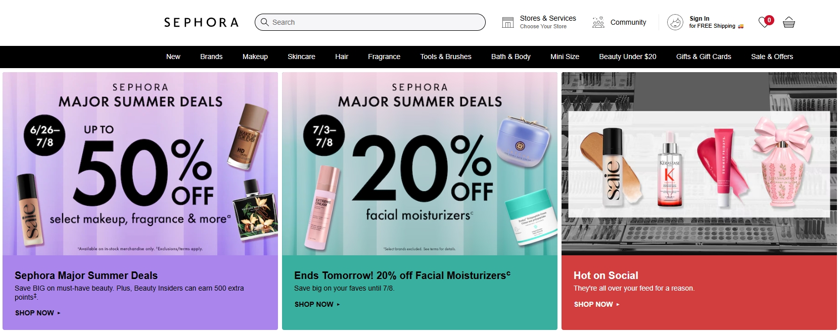 Sephora homepage showcasing major summer deals with product categories like makeup, fragrance, facial moisturizers, and trending social picks