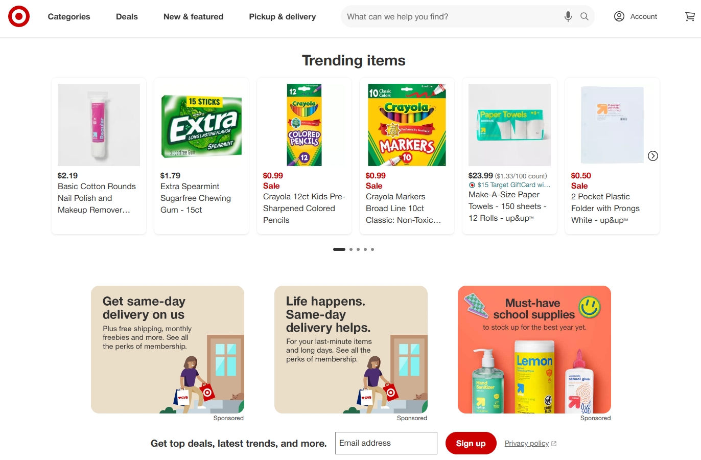 Target website homepage showcasing trending items and seasonal back-to-school promotions