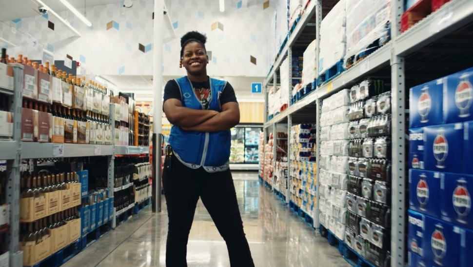 Retail employee standing confidently in the middle of a Walmart aisle, surrounded by well-stocked shelves of beverages and packaged goods