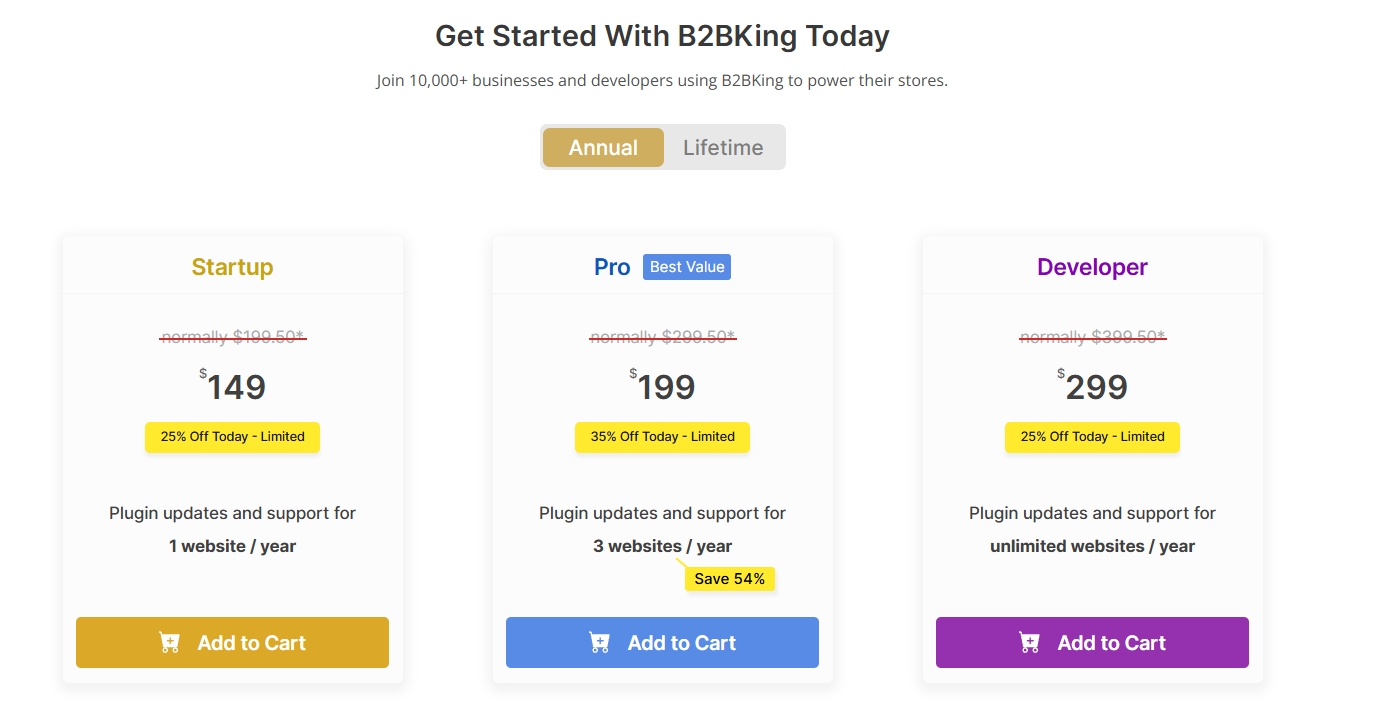 On the other hand, B2BKing is suitable for testing with its free version. But the free plan is too limited for bigger stores. To unlock the real power, you need to go Pro. The lifetime license is appealing if you prefer not to opt for yearly renewals, but even with Pro, you will not receive built-in payments or as many bundled tools as Wholesale Suite.