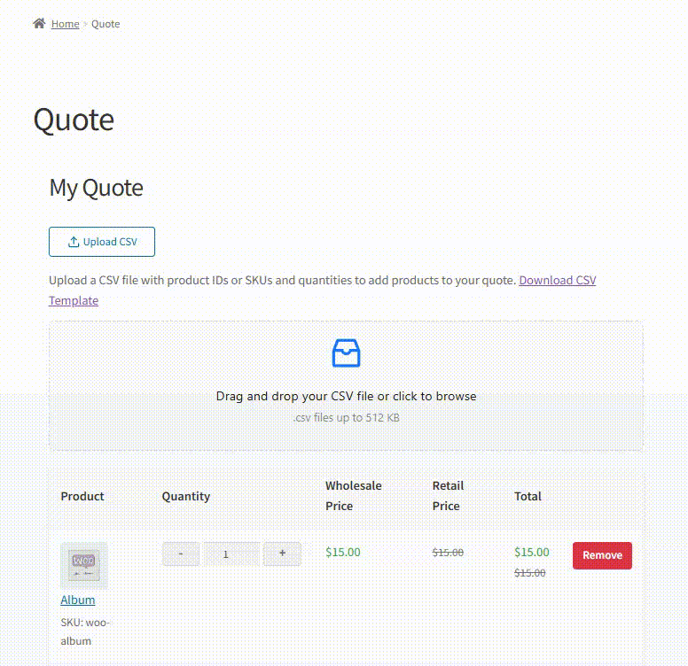 For store admins, CSV upload also provides a practical way to handle purchase orders received by email. Instead of manually searching for each product, an admin can paste the SKUs and quantities from the emailed order into the CSV template and upload it directly to the quote editor. The feature also works for guest buyers, provided guest quotes are enabled in your Wholesale Quotes settings.
