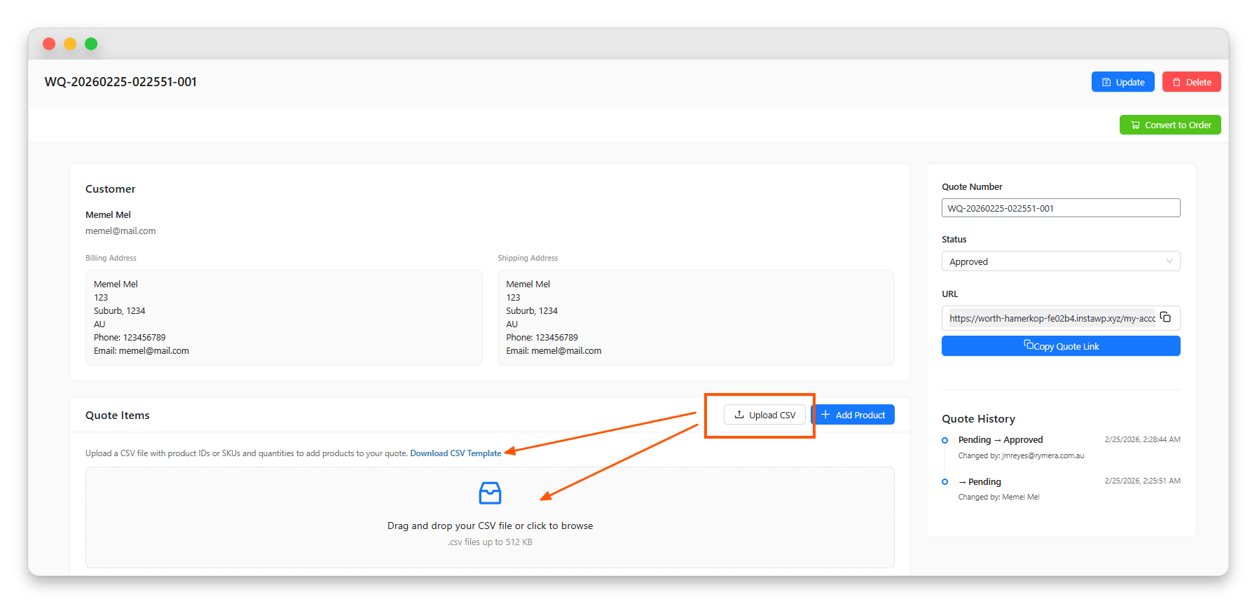 The quote details page allows admins to upload a CSV file or add products manually to update and manage quote items efficiently