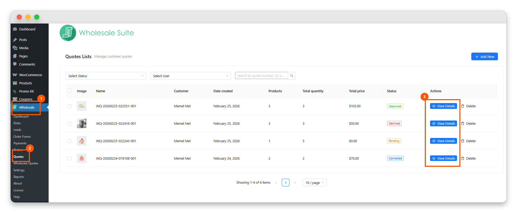 Wholesale Suite quotes list page in WordPress showing customer quotes with status, total price, and view details action buttons